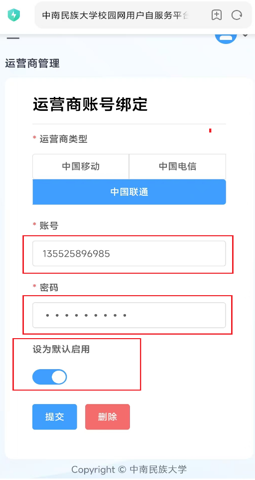進(jìn)入WebVPN系統(tǒng)后,在“業(yè)務(wù)系統(tǒng)”菜單中查找校園網(wǎng)用戶自服務(wù)平臺(tái)(如圖3所示),點(diǎn)擊進(jìn)入校園網(wǎng)用戶自服務(wù)平臺(tái)(https://selfservice.scuec.edu.cn),選擇相關(guān)運(yùn)營商,并填入所分配的光網(wǎng)賬號(hào),并將“設(shè)為默認(rèn)啟動(dòng)”按鈕開啟,點(diǎn)擊“提交”按鈕完成上網(wǎng)類型綁定(如圖4所示,以“中國聯(lián)通”為例)。