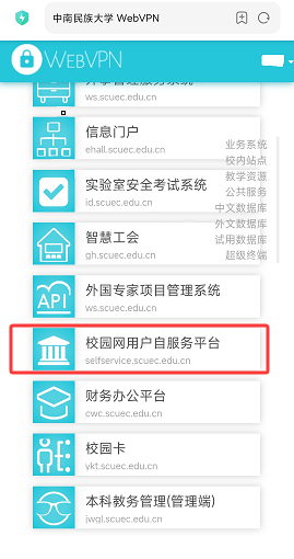 圖2 WebVPN登錄界面圖 圖3 校園網(wǎng)用戶自服務(wù)平臺(tái)