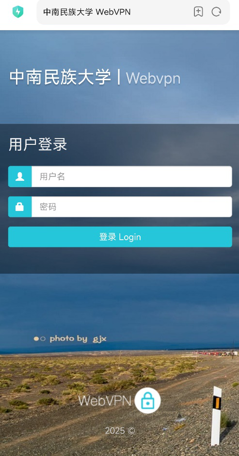 ·運(yùn)營商用戶:需移步至校內(nèi)運(yùn)營商營業(yè)點(diǎn)辦理相關(guān)套餐(注冊(cè))。辦理完成后,進(jìn)入中南民族大學(xué)WebVPN系統(tǒng)(https://webvpn.scuec.edu.cn),用學(xué)號(hào)和統(tǒng)一身份認(rèn)證系統(tǒng)密碼登錄(如圖2所示)。