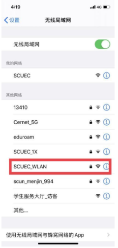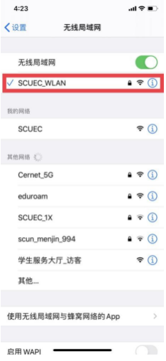 (1)打開(kāi)“設(shè)置”——“WLAN”,開(kāi)啟“無(wú)線局域網(wǎng)”,等待搜索到“SCUEC_WLAN”信號(hào);