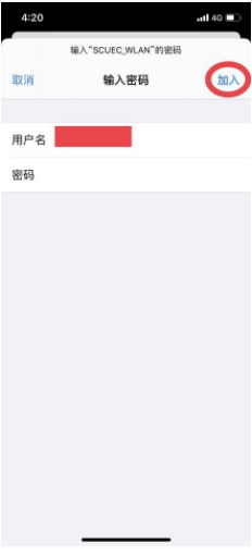 (2) 連接無(wú)線信號(hào)“SCUEC_WLAN”,用戶名密碼欄對(duì)應(yīng)輸入“信息門(mén)戶賬號(hào)”及“密碼”后,點(diǎn)擊“加入”即可;