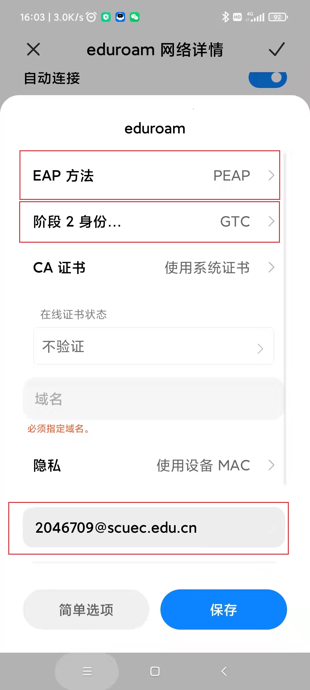 2、選擇“eduroam”后,會(huì)自動(dòng)彈出登錄頁面,EAP方法選擇“PEAP”,階段2身份驗(yàn)證選擇“GTC”,在身份和密碼處輸入eduroam帳號(hào)和密碼(中南民族大學(xué)大學(xué)師生出訪時(shí),eduroam賬號(hào)為工號(hào)或?qū)W號(hào)@scuec.edu.cn,密碼為中南民族大學(xué)信息門戶的密碼;訪客來訪時(shí),其eduroam賬號(hào)為其原機(jī)構(gòu)賬號(hào)@原機(jī)構(gòu)所在域名,密碼為其原機(jī)構(gòu)賬號(hào)的密碼),點(diǎn)擊“連接”,如下圖: