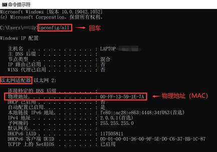 2.進入命令提示符后輸入“ipconfig/all”,回車。就可以看到這臺電腦的以太網物理地址(MAC地址)。