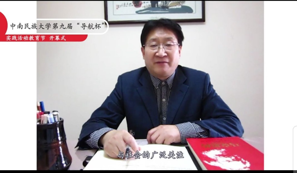 4月30日下午18:30,中南民族大學第九屆“導航杯”實踐教育活動節通過線上隆重開幕。開幕式以視頻形式向全校師生推廣,馬克思主義學院院長楊金洲致開幕辭,校黨委副書記、副校長宋發軍宣布開幕。
