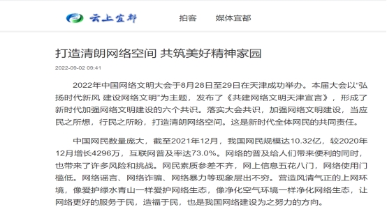 該文章以2022年舉辦的中國(guó)網(wǎng)絡(luò)文明大會(huì)中發(fā)布的《共建網(wǎng)絡(luò)文明天津宣言》為出發(fā)點(diǎn),分析如今網(wǎng)絡(luò)生態(tài)現(xiàn)狀,結(jié)合十八大以來(lái)黨中央對(duì)網(wǎng)絡(luò)文明建設(shè)的重視,解讀出新時(shí)代網(wǎng)絡(luò)文明建設(shè)的重要性,呼吁社會(huì)各界持續(xù)發(fā)力,打造清朗網(wǎng)絡(luò)空間,共建網(wǎng)上美好家園,爭(zhēng)當(dāng)做好新時(shí)代的好網(wǎng)民。全文如下: