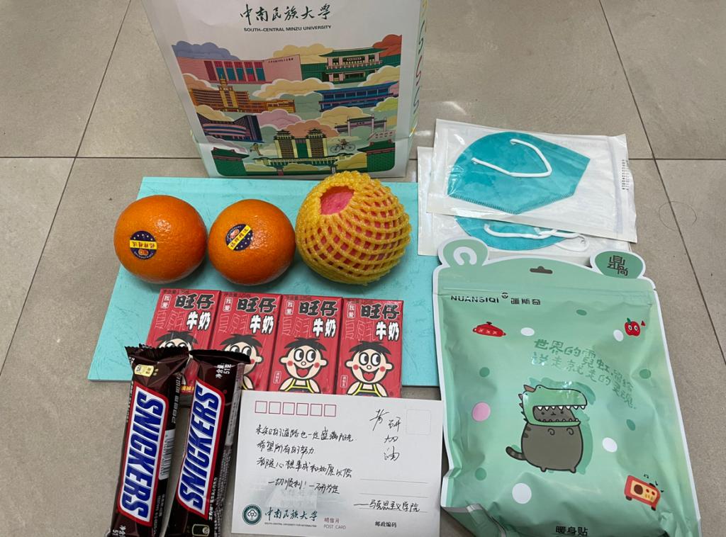 2022年12月14日,在2023屆全國碩士研究生招生考試即將到來之際,我院再次開展“濃情暖心、一研為定”助力考研活動,為考研學子精心準備“考研加油包!每份加油包飽含著學院滿滿的祝福:蘋果,“蘋”安順利;橙子,“橙”功上岸;暖寶寶,溫“暖”予你;旺仔牛奶,做上岸的仔;士力架,能量滿滿,以及手寫考研祝福語的民大馬院明信片和考生需要的N95的口罩等暖心禮品,飽含著學院對考研學子的溫暖與愛,一句句加油鼓勁的話語,凝聚著深深的祝福與期許!