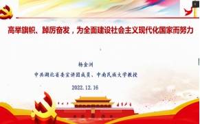 為幫助基層群眾更好學(xué)習(xí)領(lǐng)會(huì)黨的二十大精神,推動(dòng)黨的二十大精神在基層落地生根,根據(jù)省委宣傳部統(tǒng)一部署,12月15-16日,中南民族大學(xué)“理論熱點(diǎn)面對(duì)面”實(shí)踐基地開(kāi)展學(xué)習(xí)貫徹黨的二十大精神“百馬行動(dòng)”線(xiàn)上宣講活動(dòng)。中南民族大學(xué)馬克思主義學(xué)院院長(zhǎng)楊金洲教授、副院長(zhǎng)黎海波教授、易新濤教授、朱磊副教授,為恩施市屯堡鄉(xiāng)干部群眾宣講黨的二十大精神。恩施屯堡鄉(xiāng)黨委書(shū)記雷世軍帶領(lǐng)黨委及鄉(xiāng)政府班子成員、機(jī)關(guān)工作人員參加報(bào)告會(huì),組織屯堡居委會(huì)、車(chē)壩村、楊家山村及屯堡鄉(xiāng)中心學(xué)校干部群眾參加宣講會(huì)。本次活動(dòng)由恩施市屯堡鄉(xiāng)副鄉(xiāng)長(zhǎng)易思齊主持。