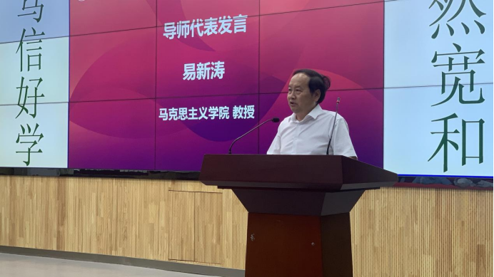 馬克思主義中國化專業(yè)的易新濤教授作為研究生導(dǎo)師代表致辭。他深刻闡述了馬克思主義學(xué)院教師嚴(yán)謹(jǐn)求實的治學(xué)態(tài)度和潤己澤人的師德師風(fēng),并結(jié)合自身的教學(xué)科研經(jīng)歷分享了為人為學(xué)的心得體會。他勉勵大家要珍惜大好時光,“學(xué)做人之道”“練就看家本領(lǐng)”“行天下之大道”,努力成為在思想上、本領(lǐng)上和社會責(zé)任感上都有所成就的人。