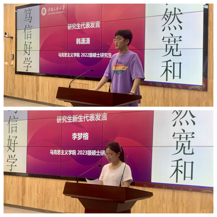 2022級黨的建設(shè)專業(yè)韓瀟瀟同學(xué)、2023級馬克思主義發(fā)展史專業(yè)學(xué)生李夢格同學(xué),分別作為在校生代表、新生代表作了發(fā)言。他們分享了各自的學(xué)習(xí)實踐體會和對未來學(xué)習(xí)生活的期待,并表示要與全體同學(xué)一道,同向同行、攜手奮進,珍惜時光、把握時機,爭做有理想、敢擔(dān)當(dāng)、能吃苦、肯奮斗的新時代好青年,讓青春在全面建設(shè)社會主義現(xiàn)代化國家的火熱實踐中綻放絢麗之花。