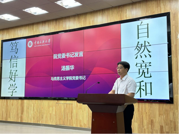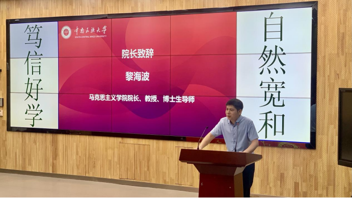 開學(xué)典禮在莊嚴(yán)的國歌聲中拉開帷幕。院長黎海波教授首先致辭,他對新同學(xué)們表示熱烈歡迎,并向全體教師致以節(jié)日的問候。“馬克思主義博大精深,歸根結(jié)底就是一句話,為人類求解放。”黎海波引用習(xí)近平總書記的重要論述,解釋了“解放”一詞的深刻內(nèi)涵。他引用陳望道“誤把墨汁當(dāng)紅糖”的故事,引發(fā)大家對于什么是真正幸福的思考,指出“真正的幸福應(yīng)當(dāng)是有意義的快樂,付出帶來的滿足才是幸福。”隨后,黎海波從學(xué)科建設(shè)、科研工作、人才培養(yǎng)三個方面向新生詳細介紹了學(xué)院基本情況,要求同學(xué)們珍惜韶華、勤奮學(xué)習(xí)。