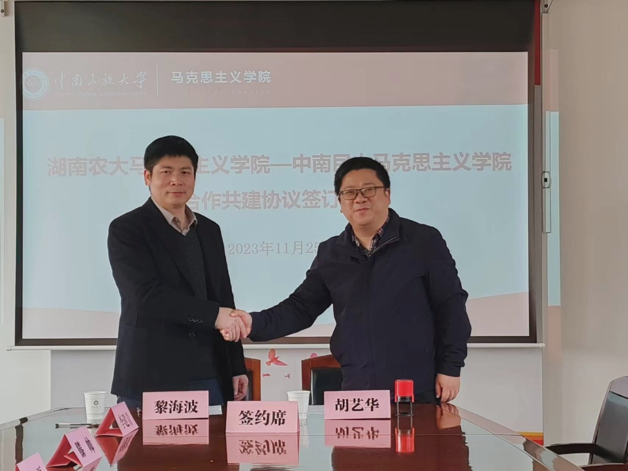 為深入貫徹落實習(xí)近平總書記關(guān)于加強馬克思主義學(xué)院建設(shè)和思政課教學(xué)的系列重要指示批示精神,推動馬克思主義學(xué)院協(xié)同發(fā)展,11月25日下午,我院與湖南農(nóng)業(yè)大學(xué)馬克思主義學(xué)院在501會議室舉行共建合作協(xié)議簽署儀式。湖南農(nóng)業(yè)大學(xué)馬克思主義學(xué)院院長胡藝華,我院院長黎海波,副院長滕帥、朱磊出席協(xié)議簽署儀式。