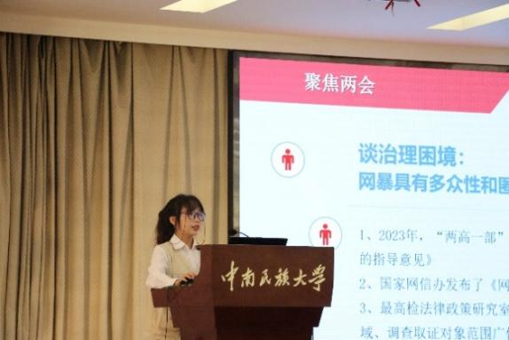 比賽采用視頻+PPT現場展示進行,19支參賽隊伍緊扣“未成年人犯罪”“網絡暴力”“非遺”等“兩會”社會熱點問題從各個維度進行解讀。王樂樂團隊以身著馬面裙的獨特方式展現了非遺文化的獨特魅力,引發了大家對非遺文化的關注與思考;賀志燦團隊聚焦預制菜與現炒菜之間的差異,揭示了預制菜的危害;張靖琦團隊通過原創視頻生動揭示了正當防衛的困境和應對之策。選手們精心設計的講解思路,生動有趣的講述內容,豐富多彩的展現形式,為觀眾呈現了一堂精彩又生動的思政課,贏得了陣陣掌聲。