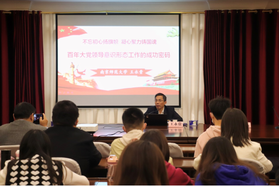 10月17日下午2點30分,馬克思主義學院在學術交流中心三樓一會舉辦“領航講堂”第21講,國家社會科學基金重大招標項目首席專家、教育部“長江學者”特聘教授、中國科學社會主義學會理事、江蘇省馬克思主義中國化研究中心特聘研究員、南京師范大學馬克思主義學院二級教授,博士生導師王永貴教授應邀為我院師生作主題為“百年大黨領導意識形態建設的成功密碼”的報告。本次講座由楊金洲院長主持,馬克思主義學院部分教師黨員及2020級、2021級研究生參加此次講座。