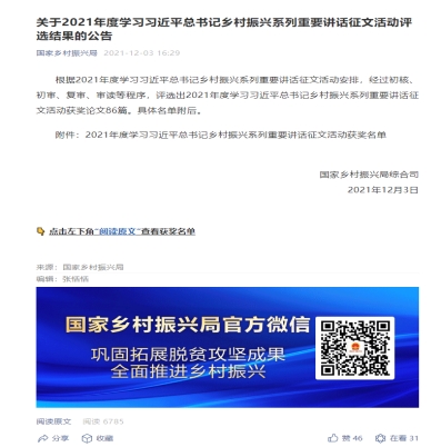 12月3日,國家鄉村振興局發布關于2021年度學習習近平總書記鄉村振興系列重要講話征文活動評選結果的公告。由我院孫明福教授撰寫的《習近平鄉村振興重要論述的豐富內涵與理論特征》一文入選獲獎名單。