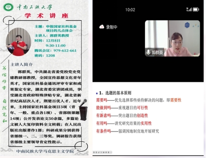 為積極推動(dòng)2024年國(guó)家社科基金申報(bào)工作,加強(qiáng)有組織的科研,促進(jìn)學(xué)院科研高質(zhì)量發(fā)展,12月8日上午,中共湖北省委黨校郭群英教授應(yīng)我院邀請(qǐng)?jiān)诰€作“國(guó)家社科基金申報(bào)的技巧和方法”的專題輔導(dǎo)報(bào)告。我院部分師生線上參加報(bào)告會(huì),報(bào)告會(huì)由副院長(zhǎng)瞿曉琳主持。