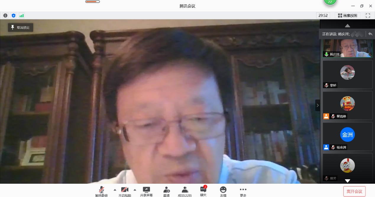韓慶祥教授從“中國智慧”出發,從哲學角度高度概括出實事求是,以人民為中心,堅持統籌兼顧,堅持精準施策,秉持人類命運共同體五大“智慧”。并結合疫情從理論、實踐、觀點、案例等多角度講解抗疫當中所彰顯的中國智慧。從中提煉出六點中華民族偉大抗疫精神:精準施策的科學精神,使命在肩的擔當精神,舍生忘死的奉獻精神,眾志成城的團結精神以及命運共同的協和精神。韓慶祥教授特別強調,五個“中國智慧”從根本上體現了中國共產黨的集中統一領導。中國智慧是中國精神的根源,中國精神蘊含在中國智慧之中。
