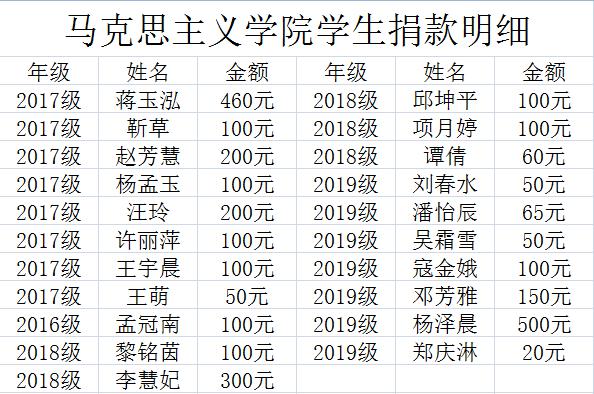 馬克思主義學院不僅有優秀教師以身作則,其學生同樣為此次“戰”疫行動做出了自己的貢獻。以2017級黨員蔣玉泓為代表的多名學生,自發以捐款的形式助力戰疫,他們用自己的行動使大家對中南民族大學馬克思主義學院有了更新的認識。
