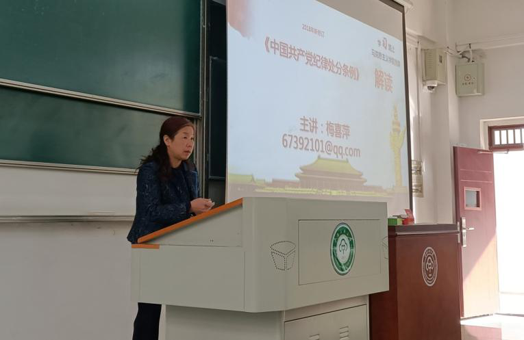 11月15日下午,我院于11號(hào)教學(xué)樓208教室開(kāi)展了關(guān)于《中國(guó)共產(chǎn)黨紀(jì)律處分條例》解讀的黨課。本次黨課由我院黨委副書(shū)記梅喜萍主講,學(xué)院黨員發(fā)展對(duì)象70人參加此次黨課學(xué)習(xí)。