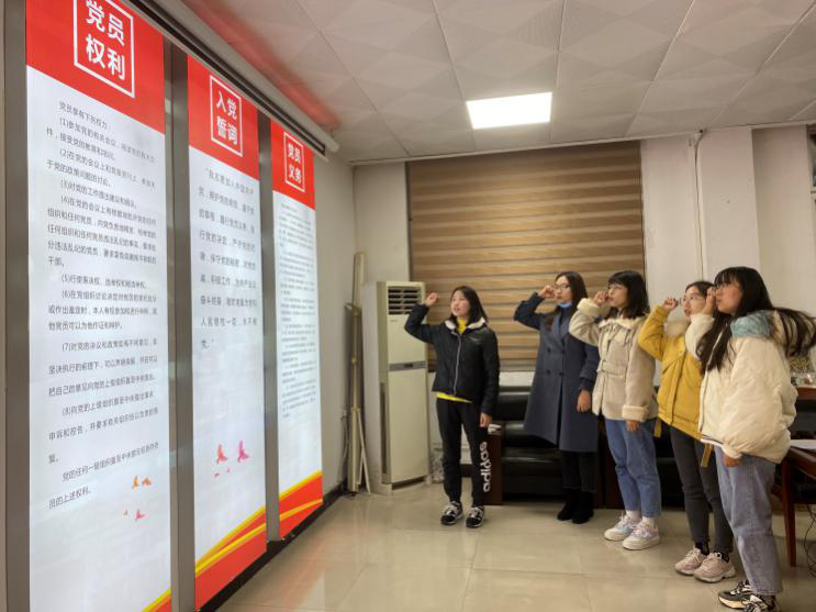 會議通過了同意接收譚宇、王珍、周從敏、王元惠4名同志轉為正式黨員的決議,支部紀檢委員覃小林同志代表支委對轉正黨員及老黨員同志提要求。覃小林同志強調,第一,要講政治。堅持黨的領導,堅持民主集中制原則,做純粹的馬克思主義者。第二,要明道德。共產黨員最大的道德就是要全心全意為人民服務,要做示范者和優秀的先鋒模范者。第三,要密切聯系群眾,充分發揮黨員在群眾中的影響力、領導力和號召力。大家對轉為正式黨員同志表達祝賀。宣誓儀式上,4位新同志高舉右拳,面向黨徽莊嚴宣讀入黨誓詞。支部宣傳委員王路瑤同志領誓,與會同志監誓。