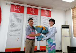 會議最后,支部共同慶賀揭佳新老師光榮退休,由青年教師董梅昊老師代表支部向揭佳新老師獻花,在場同志肯定了揭佳新老師從教40多年作出的貢獻,并向揭佳新老師表示了衷心的祝福。
