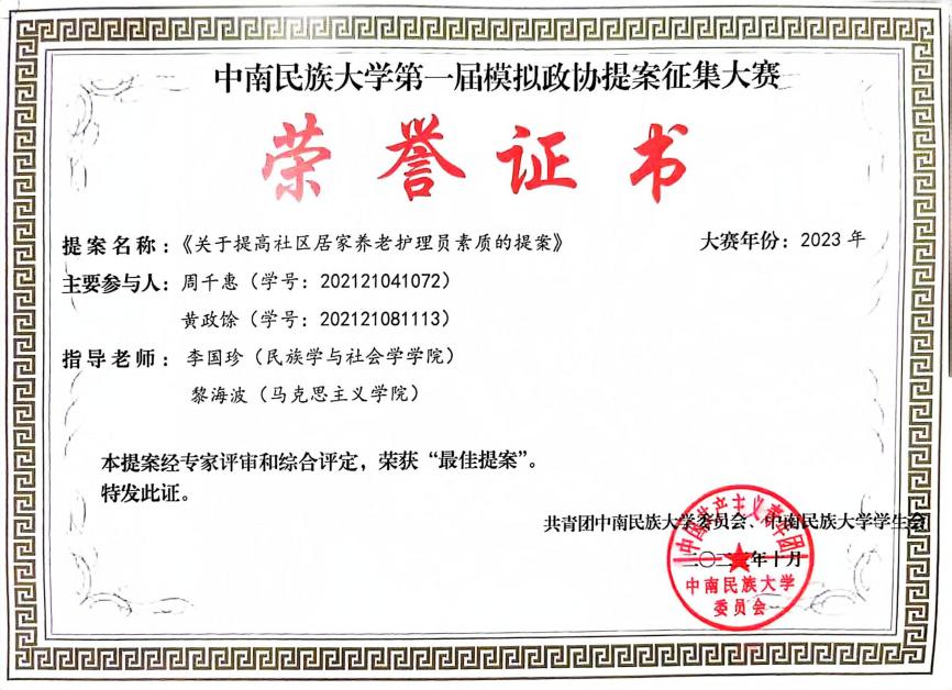 11月8日,中南民族大學第一屆模擬政協(xié)提案征集大賽結果揭曉,由我院院長黎海波教授參與指導,我院思想政治教育專業(yè)2021級本科生黃政馀與民社學院社會工作專業(yè)2021級本科生周千惠合作撰寫的《關于加強社區(qū)居家養(yǎng)老護理員隊伍建設的提案》綜合得分位列榜首,獲評最佳模擬政協(xié)提案作品,并被推薦參加省級比賽。