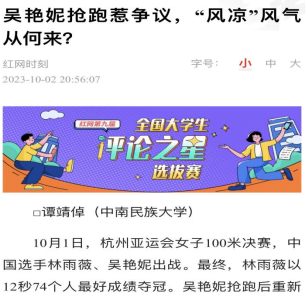 10月2日,我院思想政治教育專業(yè)2021級(jí)本科生譚靖倬在“紅網(wǎng)”上發(fā)表題為《吳艷妮搶跑惹爭(zhēng)議,“風(fēng)涼”風(fēng)氣從何來?》的評(píng)論文章。文章討論了中國(guó)選手吳艷妮在杭州亞運(yùn)會(huì)女子100米決賽中搶跑導(dǎo)致成績(jī)?nèi)∠l(fā)的爭(zhēng)議,強(qiáng)調(diào)了正確理解事件經(jīng)過、拋棄偏見、給予運(yùn)動(dòng)員尊重和支持的重要性。該文入圍了紅網(wǎng)第九屆“全國(guó)大學(xué)生評(píng)論之星”選拔賽。
