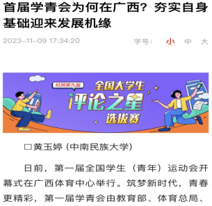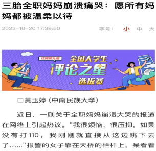 10月20日,我院思想政治教育專業(yè)2021級(jí)本科生黃玉婷在“紅網(wǎng)”上發(fā)表題為《三胎全職媽媽崩潰痛哭:愿所有媽媽都被溫柔以待》的評(píng)論文章。文章通過講述一位三胎全職媽媽遭遇的困境和壓力,呼吁社會(huì)更好地珍惜和愛護(hù)全職媽媽們的努力和奉獻(xiàn)。該文入圍了紅網(wǎng)第九屆“全國(guó)大學(xué)生評(píng)論之星”選拔賽。11月9日,黃玉婷又在“紅網(wǎng)”發(fā)表題為《首屆學(xué)青會(huì)為何在廣西?夯實(shí)自身基礎(chǔ)迎來發(fā)展機(jī)緣》的評(píng)論文章,介紹了第一屆全國(guó)學(xué)生(青年)運(yùn)動(dòng)會(huì)在廣西舉辦的原因和意義,鼓勵(lì)青年要為實(shí)現(xiàn)國(guó)家偉大復(fù)興貢獻(xiàn)力量,為建設(shè)人類命運(yùn)共同體共同努力。
