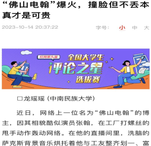 10月14日,我院思想政治教育專業(yè)2021級(jí)本科生龍瑤瑤同學(xué)在“紅網(wǎng)”上發(fā)表題了為《“佛山電翰”爆火,撞臉但不丟本真才是可貴》的評(píng)論文章。該文探討了名為“佛山電翰”的網(wǎng)絡(luò)博主因其長(zhǎng)相酷似演員張翰而在網(wǎng)絡(luò)上走紅一事,指出“佛山電翰”雖然獲得了巨大的關(guān)注和流量,卻仍保持本心、不丟本真,強(qiáng)調(diào)了對(duì)工作的熱情和堅(jiān)守的重要性。該文入圍了紅網(wǎng)第九屆“全國(guó)大學(xué)生評(píng)論之星”選拔賽。