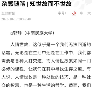 10月17日,我院思想政治教育專業(yè)2021級(jí)本科生郭靜在“紅網(wǎng)”上發(fā)表題為《知世故而不世故》的評(píng)論文章。文章認(rèn)為人情世故是一門必修課程,強(qiáng)調(diào)了知世故而不世故的重要性,即在理解和應(yīng)對(duì)人情世故的同時(shí)保持真實(shí)和真誠(chéng),在復(fù)雜的社會(huì)中保持獨(dú)立和真實(shí),成為知世故而不世故的人。該文入圍紅網(wǎng)第九屆“全國(guó)大學(xué)生評(píng)論之星”選拔賽。