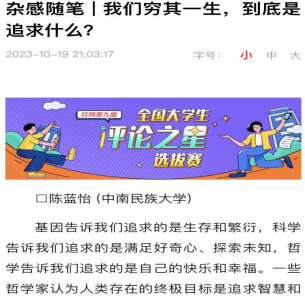 10月19日,我院思想政治教育專業(yè)2021級(jí)本科生陳藍(lán)怡在“紅網(wǎng)”上發(fā)表題為《我們窮其一生,到底是追求什么?》的評(píng)論文章。文章認(rèn)為人們?cè)谧非笪镔|(zhì)財(cái)富和社會(huì)地位后常常感到內(nèi)心空虛,而真正追求的是內(nèi)心的平靜和滿足,呼吁人們要享受生命中的瞬間。該文入圍了紅網(wǎng)第九屆“全國(guó)大學(xué)生評(píng)論之星”選拔賽。