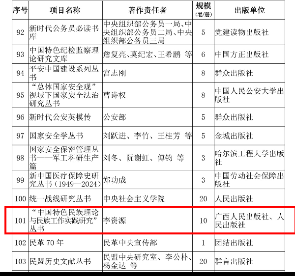 4月下旬,國家出版基金規劃管理辦公室公布了2025年度國家出版基金資助項目名單,李資源教授主持編撰、廣西人民出版社和人民出版社聯合申報的“中國特色民族理論與民族工作實踐研究叢書”入選立項資助名單。