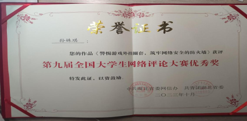 10月24日,第九屆全國大學生評論大賽結果正式揭曉,我院“南湖評論”團隊成員、思想政治教育專業2020級本科生孫姝琪撰寫的《警惕游戲外掛圈套,筑牢網絡安全的防火墻》獲評優秀獎。10月27日,“第十屆全國大學生網絡評論大賽啟動儀式”在武漢楚天傳媒大廈舉行,孫姝琪應邀作為獲獎代表出席儀式并領獎。