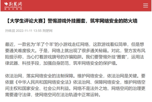 孫姝琪文章從“羊了個羊”小游戲走紅背后的外掛“圈套”出發,提出面對網絡詐騙陷阱時,我們應“運用法律武器、科技手段,加強自身防范,抵制網絡詐騙,打造風清氣正的清朗網絡空間。發揮我們的群力群智,共筑網絡安全防線,共享網絡文化成果”。文章思路清晰、觀點獨到,深入剖析現實具體案例,引發了廣大讀者對網絡安全的關注和思考,充分展現了我院學子的專業功底和學術實力。