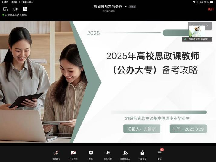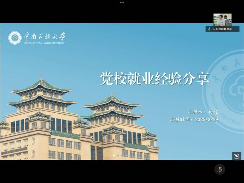 為幫助研究生同學更好地了解就業現狀、明確職業規劃、應對就業挑戰、提升求職技能,3月29日,我院舉辦優秀研究生畢業生線上就業分享會,邀請我院2024屆優秀畢業生何靖珂、李玥佳、占燚、馬超、方智祺、吳巧詩作求職就業分享。研究生輔導員李明軒老師及我院全體研究生參加分享會,會議由院研究生會主席團成員熊旭鑫主持。