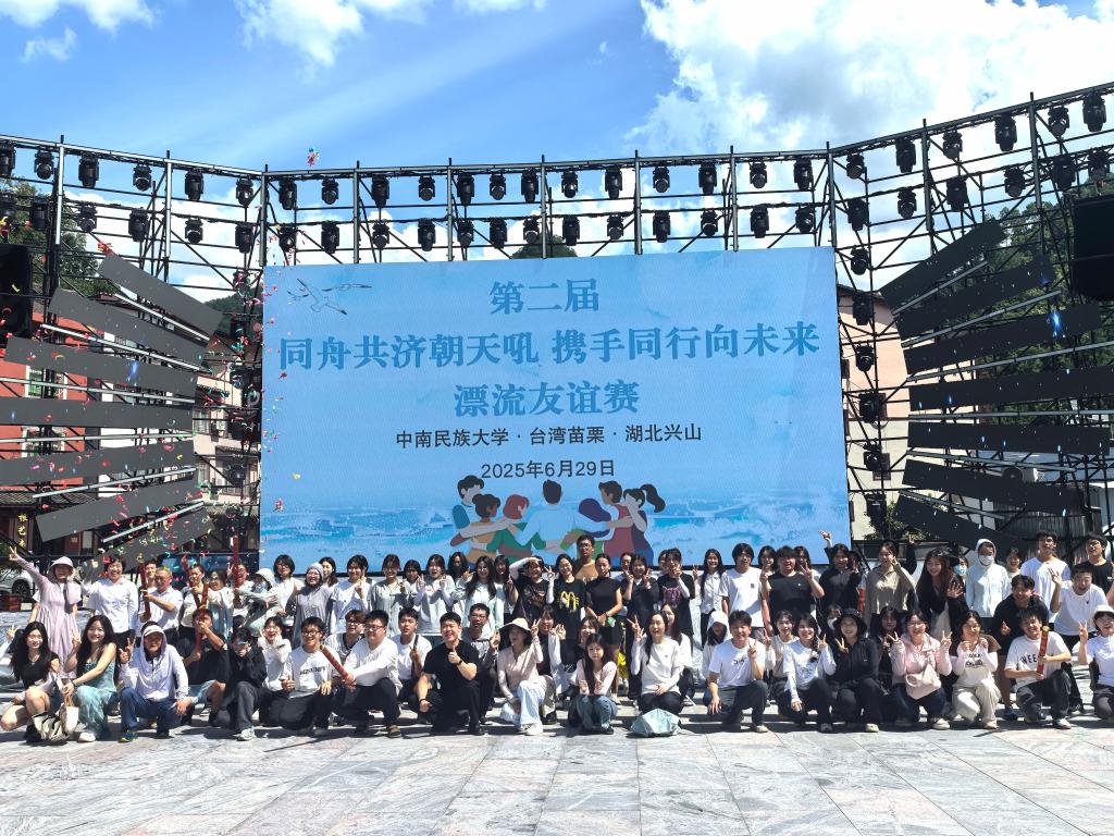 6月29日,第二屆“同舟共濟朝天吼 攜手同行向未來”漂流友誼賽在興山燃情啟幕。來自臺灣苗栗縣的26名參訪團成員與中南民族大學的65名師生以體為媒、共敘親情、共話團結。比賽特別設置混合編組環節,兩岸選手隨機組成29支隊伍,在闖險灘、越激流的過程中,緊握的雙手與相視的笑顏成為“中華民族一家親”最生動的實踐注腳。臺灣參訪團領隊謝文福與我院學生馬凱初次搭檔便默契十足,獲得比賽冠軍。通過漂流友誼賽,兩岸同胞在加深了了解、增進了感情,構建起跨越海峽的情感聯結,像石榴籽一樣緊緊抱在一起。