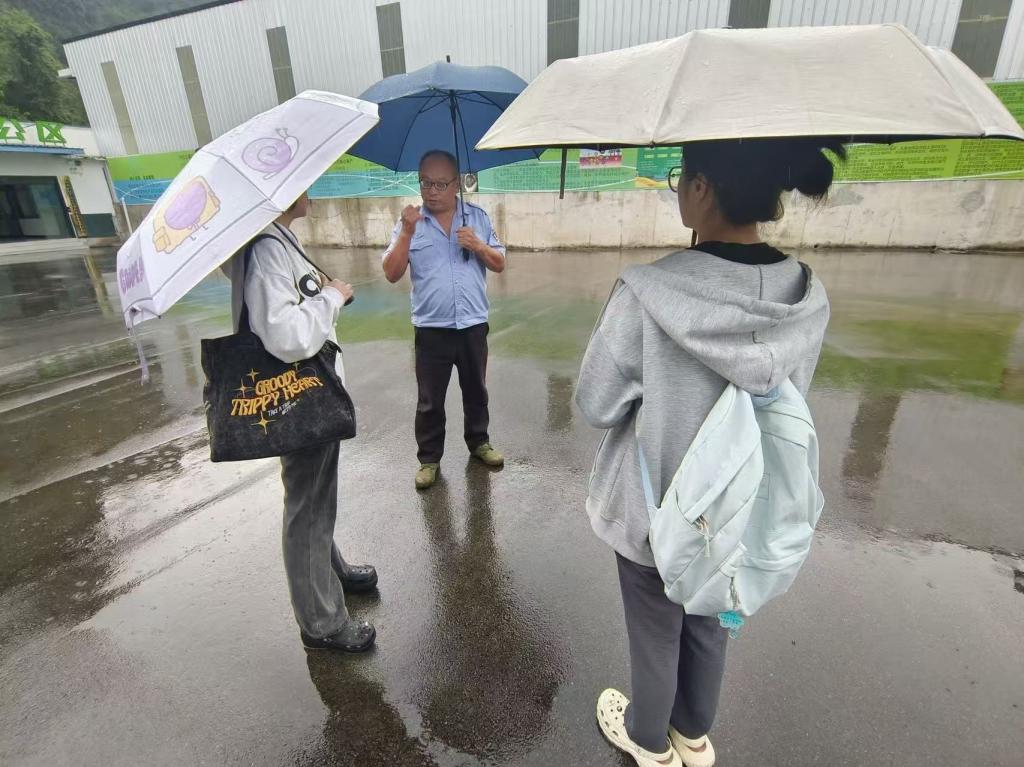 與此同時,另外幾名組員也向那位掃屋頂的爺爺打了招呼。趁著交談間隙,我們順口問起他們對村里垃圾分類等環保舉措的看法。他的妻子一直站在一旁,面容和藹慈祥,對著我們無聲地微笑。起初我們以為雨聲嘈雜她未聽清,便提高了音量。婆婆見狀,指指自己的耳朵,又輕輕擺了擺手。我們才恍然明白——她是一位聽障人士。一時靜默,我們目送著婆婆在迷蒙細雨中,邁著蹣跚的步子,緩緩走遠,身影漸漸隱入雨簾。