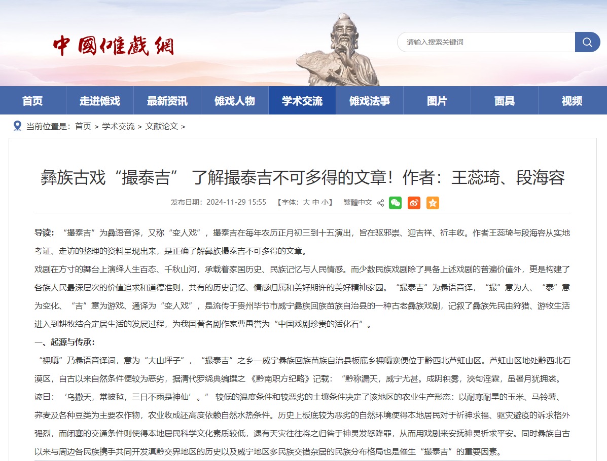 近日,由我院馬博博老師指導(dǎo),歷史學(xué)2201班王蕊琦、段海容同學(xué)完成的《中華優(yōu)秀傳統(tǒng)文化|彝族古戲“撮泰吉”》一文,被“中國(guó)儺戲網(wǎng)”全文轉(zhuǎn)載推薦。該文基于團(tuán)隊(duì)成員前往貴州畢節(jié)田野考察所得,從起源與發(fā)展、道具與表演、歷史與文化價(jià)值等方面,詳細(xì)介紹了國(guó)家級(jí)非物質(zhì)文化遺產(chǎn)——貴州彝族“撮泰吉”戲劇。