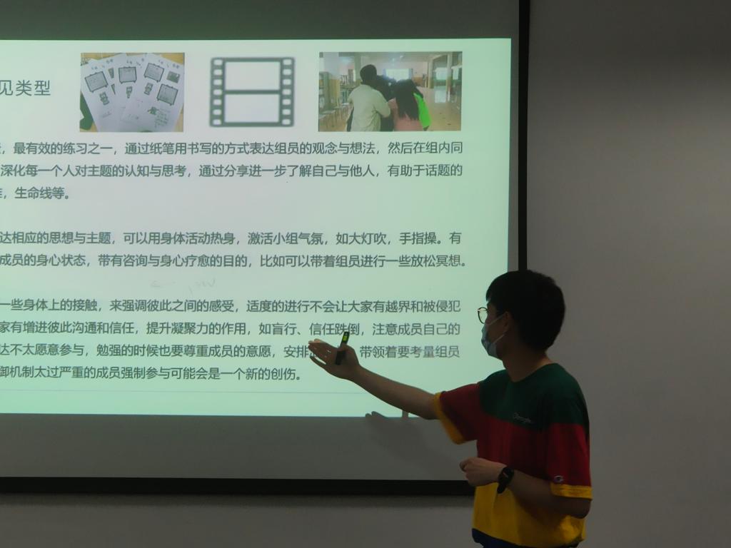 郭總干事向大家介紹了結構式小組的概念、應用原則、常見類型等。隨后,郭總干事為同學們講解了結構式小組設計的要素、思路與步驟,以及在不同階段中小組實施時需要注意的事項。郭總干事還通過一些案例讓大家對小組活動有了更深的了解,此外,他向大家提出了一個思考題,在互動中引發更深刻的思考。最后,郭總干事帶領同學們體驗了小組活動,大家積極參與并主動分享展示,反響熱烈。