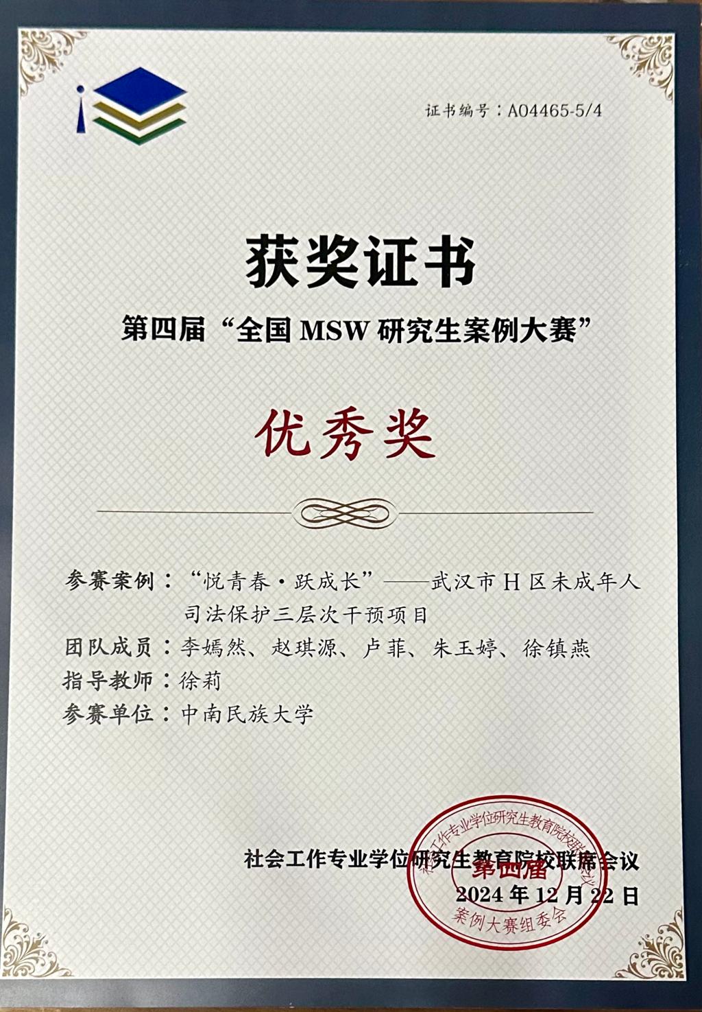2024年12月12日,第四屆“全國MSW研究生案例大賽”百強案例名單公布。我院社會工作專業研究生團隊憑借《“悅青春躍成長”——武漢市H區未成年人司法保護三層次干預項目》成功入圍全國百強,榮獲優秀獎。該項目由我院徐莉教授指導,22級社會工作研究生李嫣然擔任隊長,團隊成員包括23級社會工作專業研究生盧菲、趙琪源、徐鎮燕和朱玉婷。