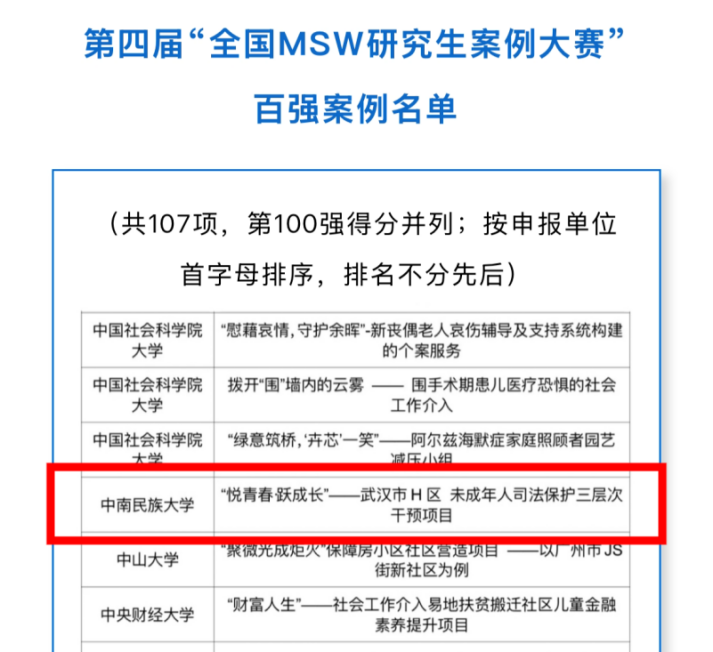 《“悅青春躍成長”——武漢市H區未成年人司法保護三層次干預項目》在此次“全國MSW研究生案例大賽”入圍百強,充分彰顯了我院在社會工作專業領域的教育成果。這一成績的取得,得益于學院在教育資源平臺建設中的悉心投入和對師生發展的持續支持,為師生提供了充足的展示才華的舞臺和寶貴的成長機會。中南民族大學MSW碩士點將繼續秉承“以賽促學、以學促提、賽學融合”的教育理念,積極鼓勵學生參與各類學術賽事,力求不斷提升專業水平,為培養更多高素質的社會工作人才貢獻力量。(責編:席鈺萍,審核:王璐璐,上傳:楊科)