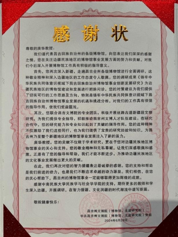 近日,我院收到了來自新疆維吾爾自治區(qū)昌吉回族自治州文博院的感謝狀,以表彰庾華教授在促進(jìn)邊疆民族地區(qū)博物館事業(yè)和文化發(fā)展中作出的杰出貢獻(xiàn)。
