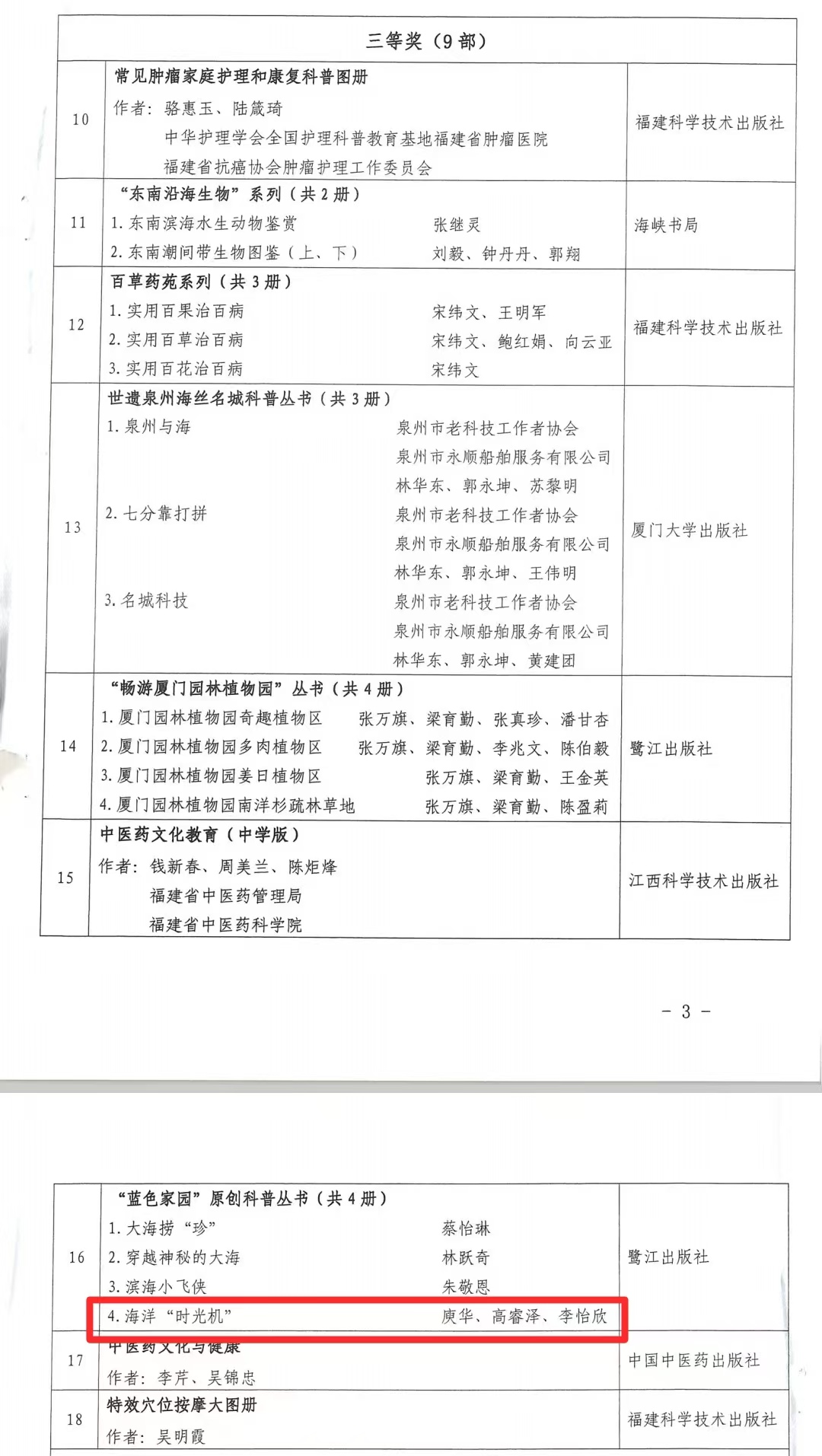 近日,福建省科學技術廳公布了2024年福建省優秀科普圖書評選活動獲獎名單。我院庾華教授主編的文物科普圖書《海洋“時光機”》榮獲三等獎。這是繼《絲路流光:絲綢之路上的文物傳奇》榮獲第34屆“金牛杯”優秀美術圖書評選銅獎后我院科普著作的又一獎項,標志著我院科普創作邁上新臺階。
