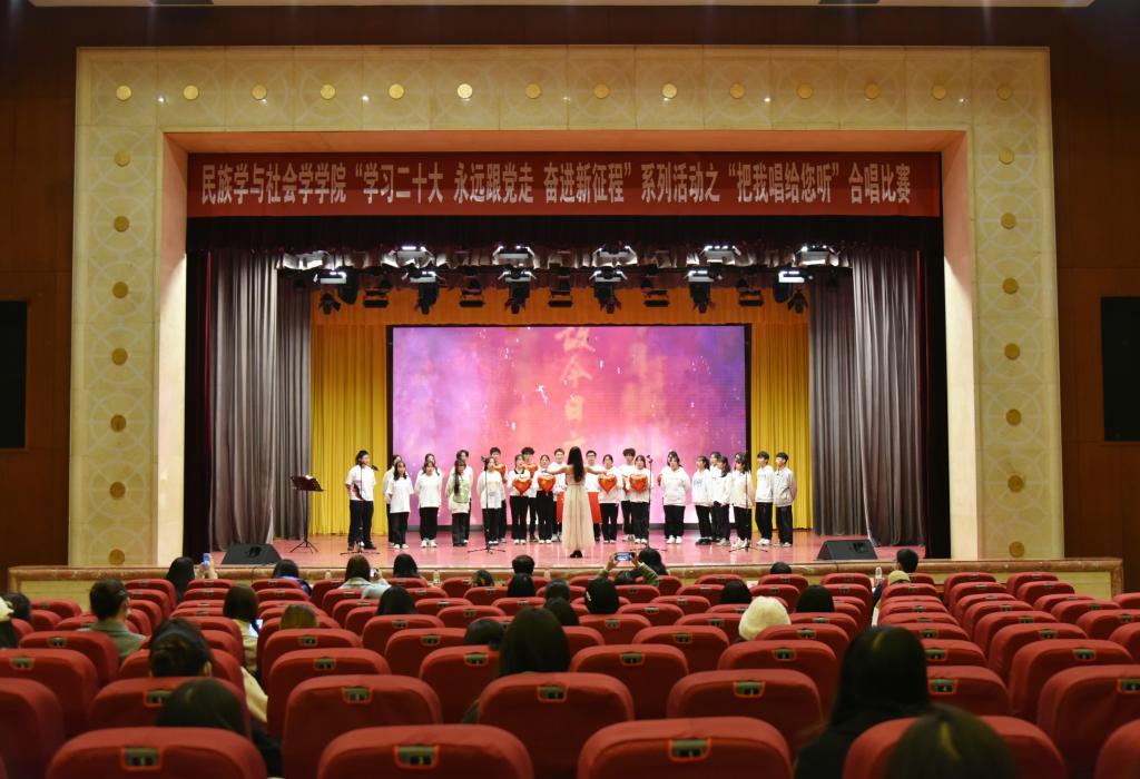 2022級全部班級、2021級部分班級共同組成的9支隊伍參賽。比賽節目由1首固定歌曲和1首自選歌曲組成。《少年中國說》《我和我的祖國》等歌曲表達了感黨恩、跟黨走,新時代青年勇擔民族復興大任的赤子情懷,體現了中國青年的積極面貌,我們應當像浪花朵朵般,在時代的浪潮中與祖國一同奔涌前進;《相親相愛》《我愛你中國》等歌曲帶我們重溫時代經典,殷殷之情寄華夏,寸寸丹心為國家,56個民族像石榴籽一樣緊緊抱在一起,在百年征程中共筑家國情懷;《國家》《一起向未來》等歌曲生動展現在邁進新時代、踏上新征程的道路上,民社學子將繼續守初心、擔使命,為國家富強、民族復興奉獻青春力量的決心。歌曲時而鏗鏘有力、時而悠長舒緩,讓觀眾評委們在動聽的旋律中追憶崢嶸歲月、感受時代脈搏、展望前路征程,比賽在一片掌聲與喝彩中落下帷幕。