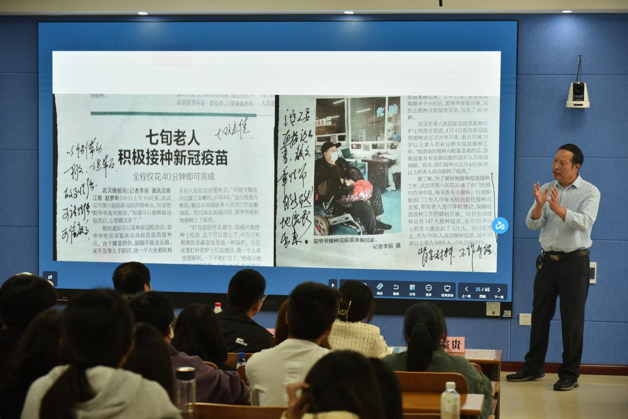 黃宗貴教授為同學們作了題為《鮮明、細致、質樸、順暢的結晶——略談新聞寫作與攝影》的第一講團課。黃教授從“所有工作都離不開新聞宣傳”入手,就政治站位、素材語言、標題句式、導語角度、文章構思和攝影構圖六方面生動形象、深入淺出地為大家進行授課,充分指出新聞宣傳學習的重要性與必要性。他強調,新聞工作者自身要提高政治站位、緊跟時事政治、廣泛涉獵學習,時刻擴充自身知識儲備。針對新聞采寫過程中普遍出現的標題平庸、導語模式化套路化等問題,黃教授結合典型新聞稿件進行分析并提出寶貴建議,他希望同學們在將信息準確、凝練表達的基礎上突破模式化,靈活采用倒金字塔式、描寫式、提問式、引用式等形式撰寫導語。同時,他對我院宣傳工作中的拍攝短板進行現身教學,要求宣傳拍攝構圖“角度理想”、“高度立體”,修改照片“精”、“準”、“狠”。