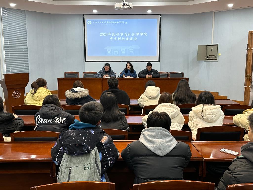 為進一步做好新學期學生開學各項工作,了解學生假期學習生活狀態和對學校、學院相關工作的意見和建議,3月1日上午,我院在八角樓報告廳召開民族學與社會學學院返校學生代表座談會。學院黨委副書記王璐璐、學工辦主任袁磊、2023級學生輔導員袁亞南出席座談會,學院各年級學生代表參與本次座談會,座談會由2022級輔導員馬博博主持。