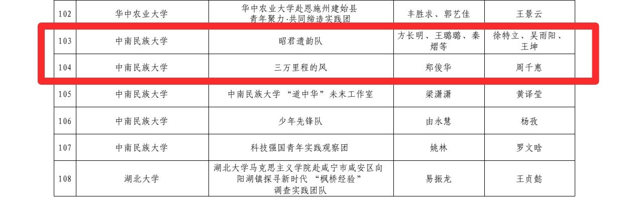 近日,湖北省暑期“三下鄉”社會實踐重點團隊立項申報審核入圍名單公布,我校五支團隊入選,其中我院“昭君遺韻隊”和“三萬里程的風”兩支團隊成功入選。