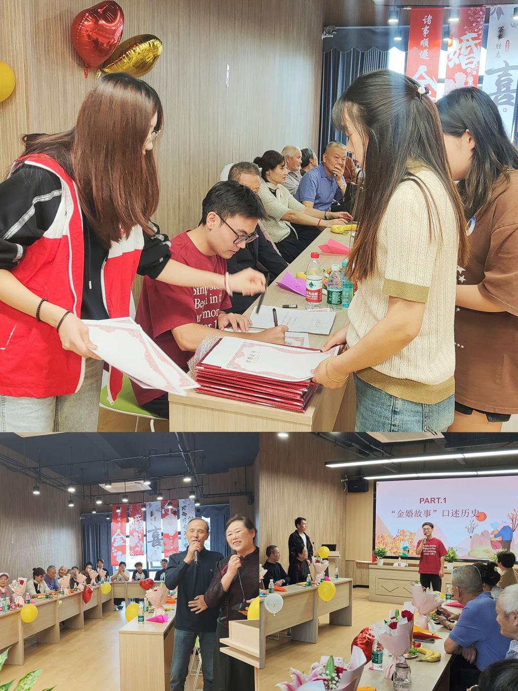 活動的高潮部分,由本支部23級社會工作專業(yè)研究生親手書寫紀念證書并為金婚夫婦們頒發(fā)。他們以最誠摯的態(tài)度,為每一對金婚夫婦書寫了專屬的紀念證書,并伴隨著鮮花一同送上。這不僅是對金婚夫婦們幾十年如一日愛情的最高贊譽,也是對他們辛勤付出和無私奉獻的最好回報。