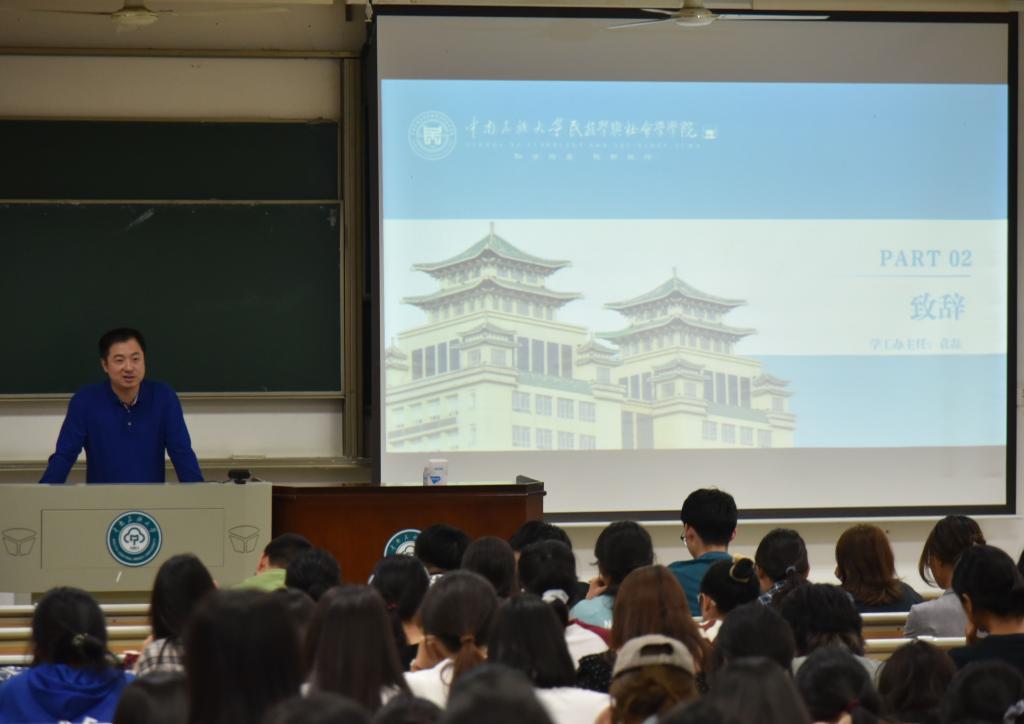 激昂的國歌聲響起,開營儀式正式拉開序幕。會議伊始,學工辦副主任袁磊致辭,歡迎各位同學加入民社學院團委學生會這個大家庭,詳細介紹了團學工作的性質,并就學生工作向全體志愿者提出六點期望:一是提升服務意識,杜絕官僚主義,熱忱服務學生;二是提高自身能力,在崗位上積極作為;三是以身作則,發揮帶頭作用;四是注重專業學習,學習工作“兩手抓”;五是提升群眾基礎,積極參與班級各項事務;六是增強集體責任感,加強團結協作。