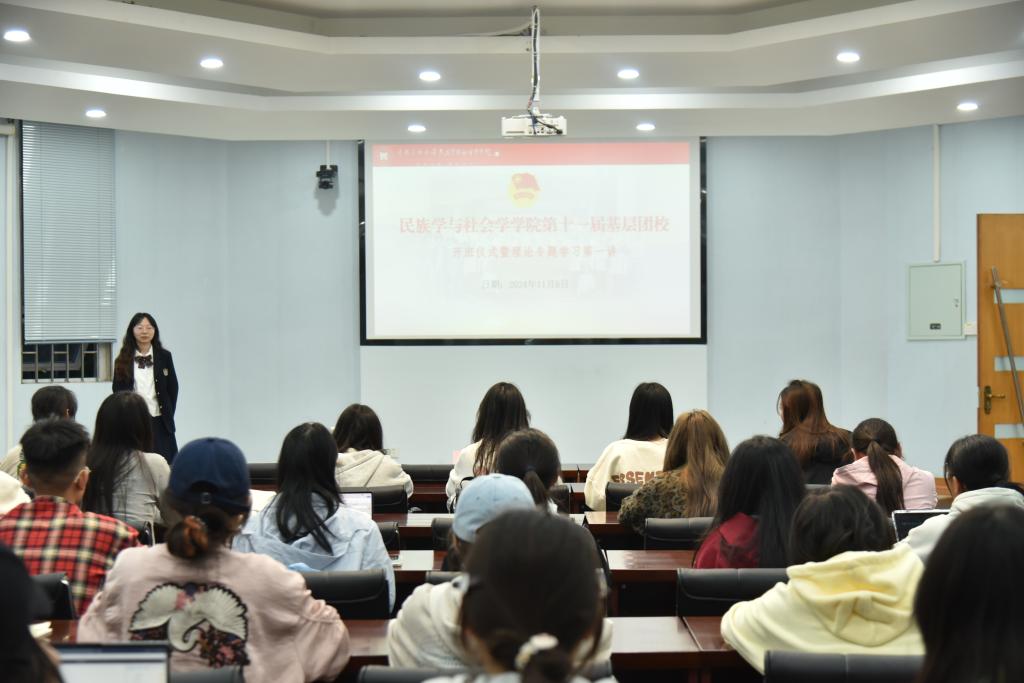 為深入學(xué)習(xí)貫徹習(xí)近平新時代中國特色社會主義思想,進(jìn)一步強(qiáng)化基層團(tuán)支部組織建設(shè),推進(jìn)青年團(tuán)員學(xué)習(xí)的專業(yè)化、規(guī)范化、標(biāo)準(zhǔn)化。11月8日晚,學(xué)院在八角樓報告廳舉辦第十一屆基層團(tuán)校培訓(xùn)班開班儀式暨理論專題學(xué)習(xí)第一講。院黨委副書記王璐璐、團(tuán)委副書記馬博博、主席團(tuán)成員及全體培訓(xùn)班學(xué)員參與開班儀式。開班儀式由丁睿玥主持。