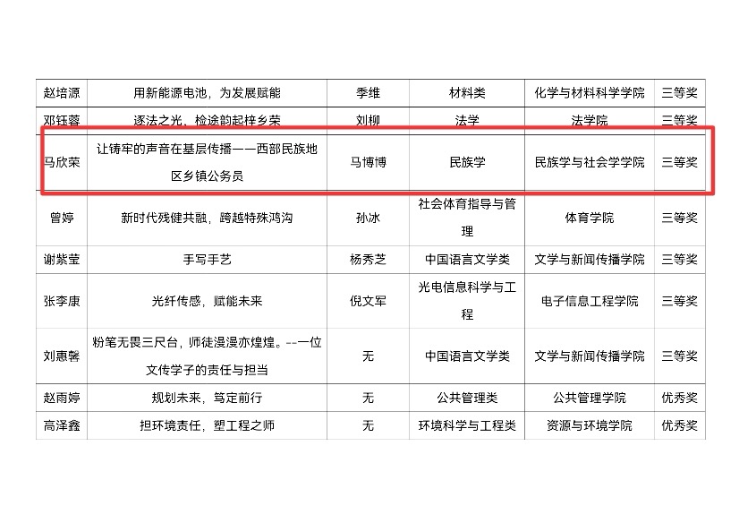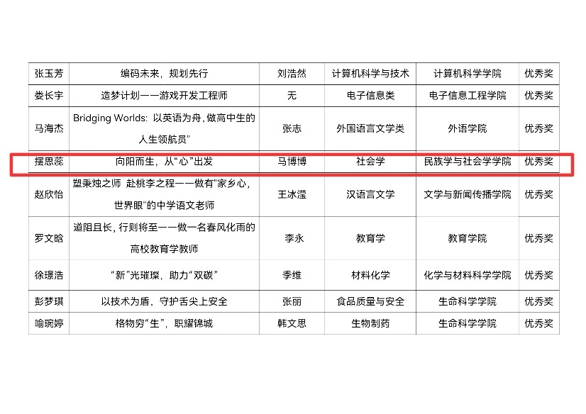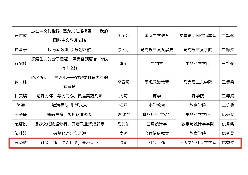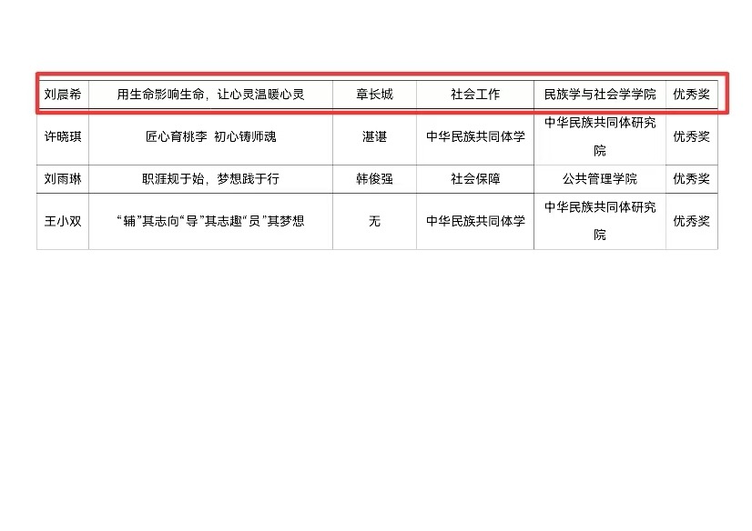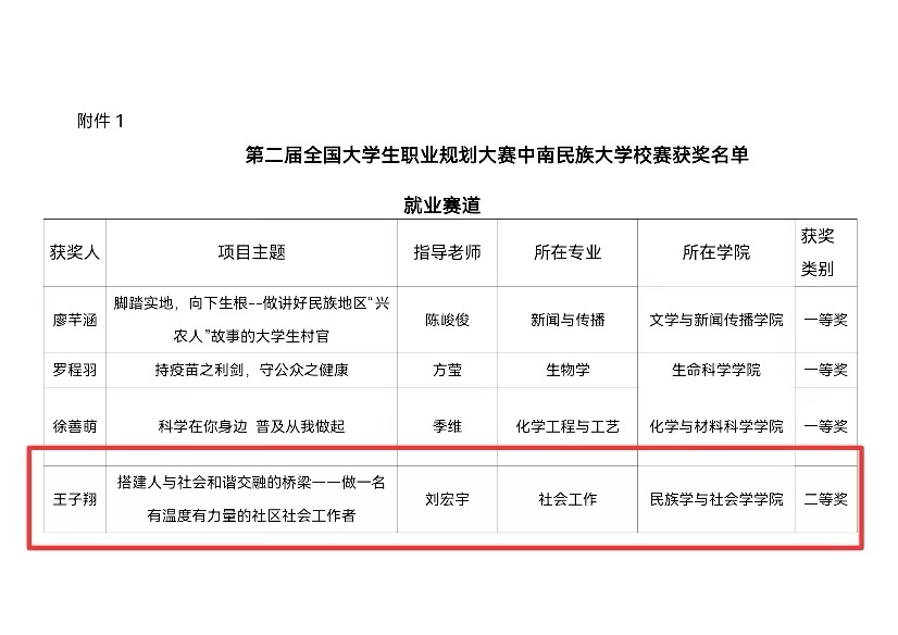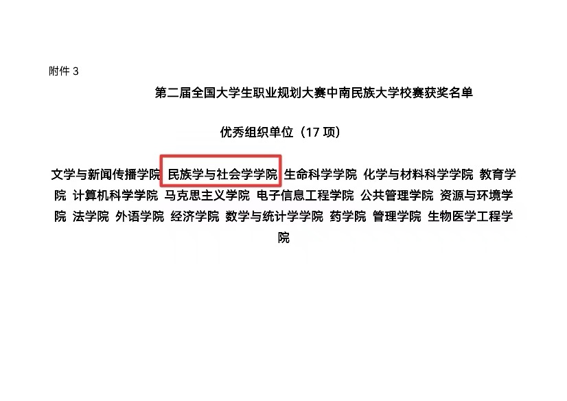 為貫徹落實黨和國家關于高校畢業生就業決策部署,加強學生職業生涯規劃與就業指導,促進畢業生高質量充分就業,我院積極組織學生參與第二屆全國大學生職業生涯規劃大賽中南民族大學校賽,王子翔在劉宏宇老師指導下獲就業賽道校級二等獎,劉晨希、姜奕敏分別在章長城、徐莉老師指導下獲就業賽道校級優秀獎;馬欣榮、擺思蕊在馬博博老師指導下分別獲成長賽道校級三等獎和優秀獎。學院榮獲“優秀組織單位”榮譽稱號。(責編:袁亞南,審核:王璐璐,上傳:楊科)